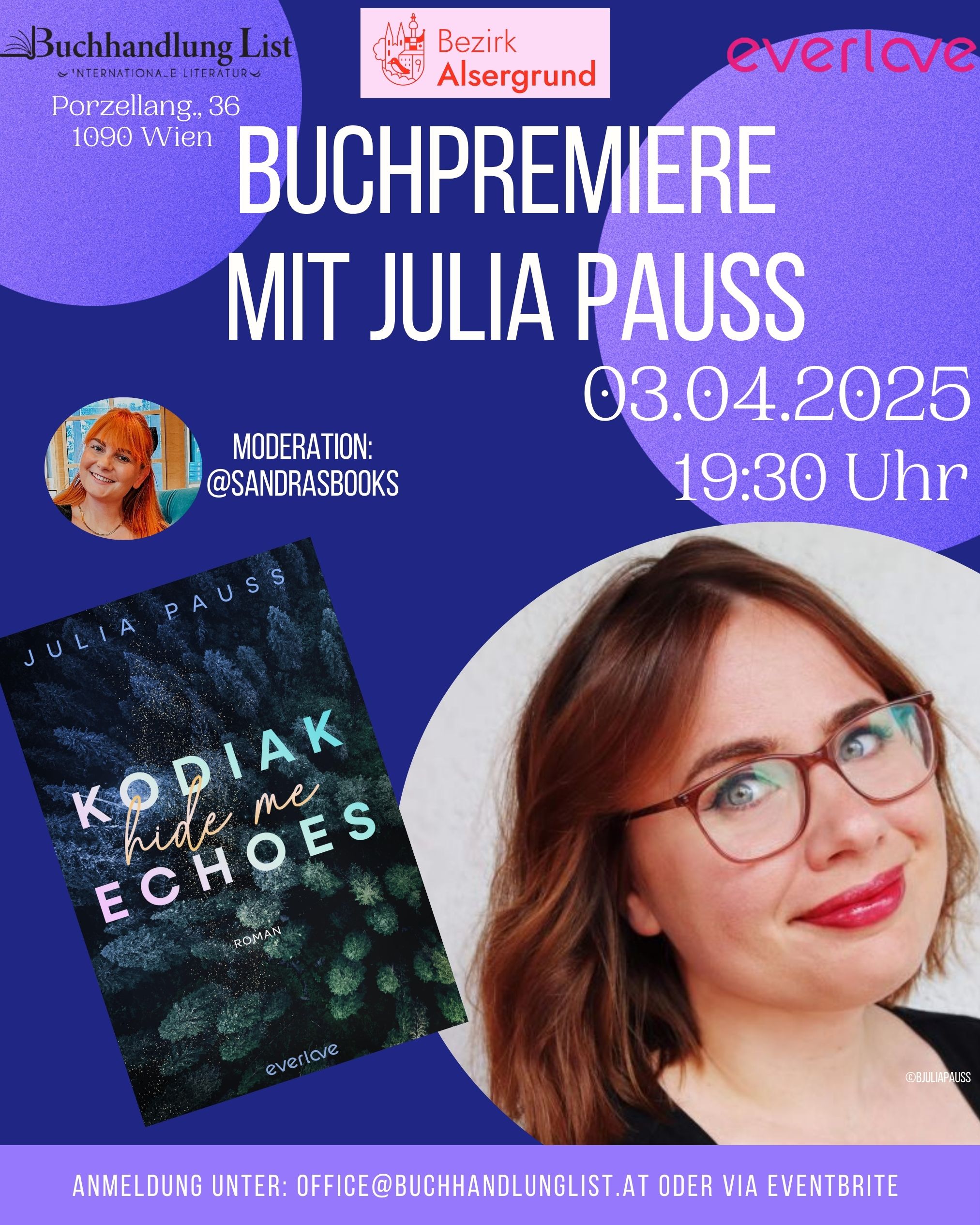 Am 3. April 2025 feiert Julia Pauss die Premiere ihres neuesten Romans Kodiak Echoes – Hide Me, dem mit Spannung erwarteten Auftakt ihrer New Adult Thriller-Reihe. Begleitet wird die Veranstaltung von der renommierten Buchbloggerin Sandra Maurer, die auf Instagram ihre Community regelmäßig mit packenden Buchtipps versorgt.