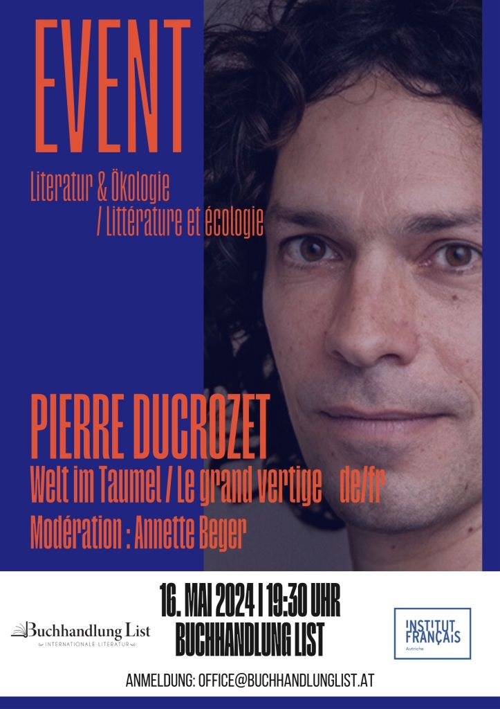 Die ganze Welt in einem Buch! Pierre Ducrozet spannt in Le grand vertige (Actes Sud 2020; dt. von Paula Rauhut: Welt im Taumel, Kommode Verlag 2024) eine Geschichte rund um den Globus, die alles, vom Homo sapiens bis Google Earth, verbindet. Adam Thobias, ein Pionier des ökologischen Denkens, übernimmt die Leitung einer Expedition: Eine Gruppe von fünfzig Weltenbummlern und eigenbrötlerischen Wissenschaftlern begibt sich auf die Suche nach dem Schlüssel zur Rettung unseres Planeten – ein Abenteuerroman des 21. Jahrhunderts, eine Schatzsuche, die ebenso Lösungen für eine mögliche Zukunft wie eine sehr konkrete Ethik des „In-der-Welt-Seins“ ins Spiel bringt. Pierre Ducrozet, 1982 in Lyon als Sohn einer österreichischen Mutter und eines französischen Vaters geboren, lebt in Barcelona und unterrichtet an der École de La Cambre. Für seine Romane wurde er mit dem Prix de la Vocation und dem französischen Prix de Flore ausgezeichnet.